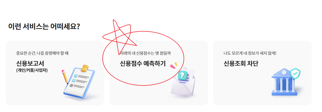 나이스 지키미 에서도 신용점수 예측하기 서비스를 제공하고 있습니다. 아래 버튼에서 확인해보세요.